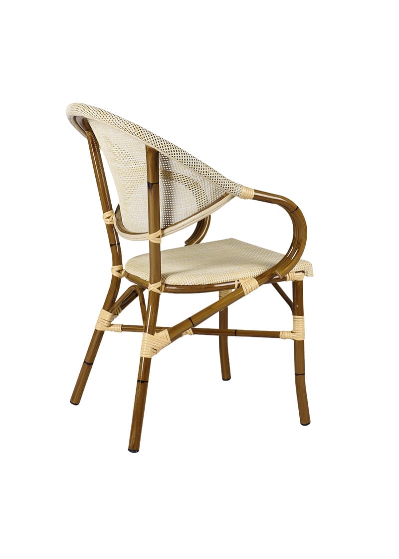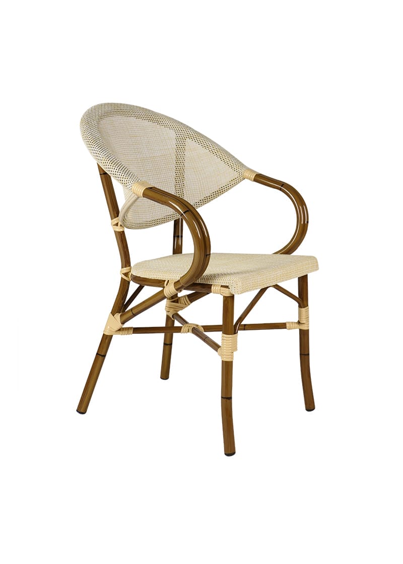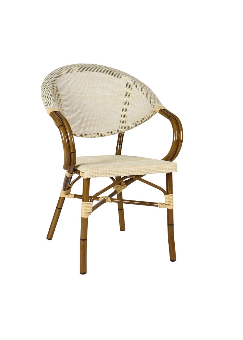 Klassisk bekväm utomhusstol. Stolstativet är tillverkat i kraftig aluminium med bambu-look. Med Ø28mm stomme. Sits i textilene-väv. Stapelbar med 6 stolar. Producerad för offentlig miljö med intensiv användning. Rekommenderas för utomhus. Finns som lagervara under säsong.